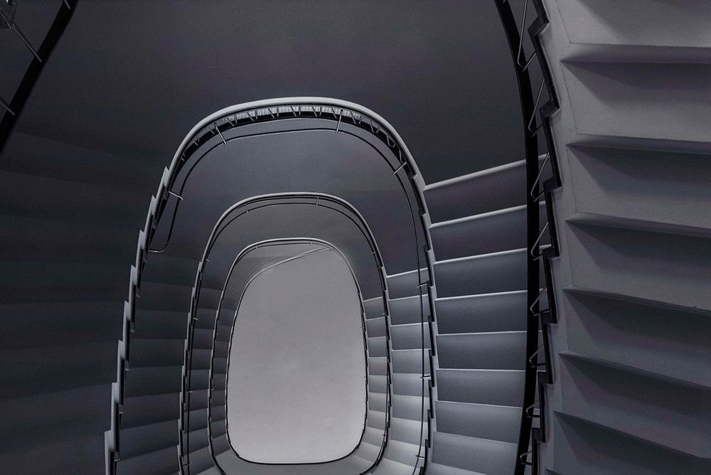 Mundharmonika-Treppe in einem deutschen Bürogebäude. Nach einigen Verhandlungen mit der Empfangsdame durfte ich diese Treppe fotografieren, leider nur von unten, wurde die Erlaubnis zum Betreten des Gebäudes nicht erteilt. Trotzdem ein schöner Fang.