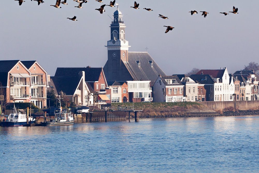 Das Dorf Lekkerkerk und Gänse, die über den Fluss Lek fliegen