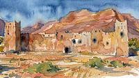 Dieses meisterhafte Aquarell vereint die monumentale Architektur einer marokkanischen Lehmburg mit der filigranen Ästhetik der arabischen Kunst. Das Werk zeigt eine verlassene Festung im Zizgebirge, deren wehrhafte Türme und Mauern in warmen Sand- und Erdtönen erstrahlen.