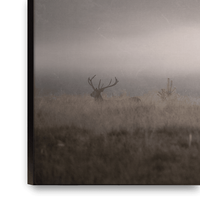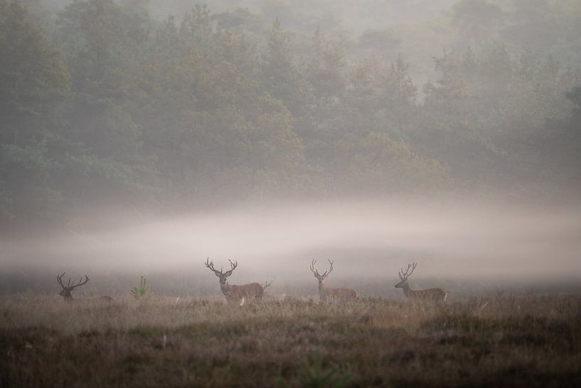 Wie Schatten im Morgennebel tauchen Rothirsche in einer Landschaft auf, die von Ruhe und Geheimnis umhüllt ist. Die Kombination aus sanften Nebelschichten, gedämpften Farben und kraftvollen Formen schafft ein Bild, das zugleich raffiniert und beeindruckend ist. Jedes Detail trägt zu einem Gefühl von Tiefe und Stille bei, wodurch der…