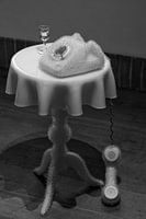 Szene eines Tisches mit einem altmodischen Wählscheibentelefon aus Glas.