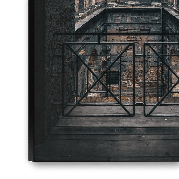 Die Farben sind gedämpft: Grautöne, fahle Brauntöne, stumpfes Orange, hier und da Spuren von Oxidation oder Restaurierung. Das Licht ist sanft und natürlich. Die Öffnung, durch die man blickt, wirkt wie ein Rahmen; der Blick wird automatisch auf den Rhythmus der Bögen und das Licht am Ende des Ganges gelenkt.
