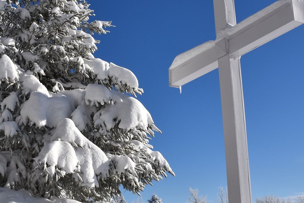 Das Kreuz auf dem Dorffriedhof im Winter, Sainte-Apolline, Quebec, Kanada