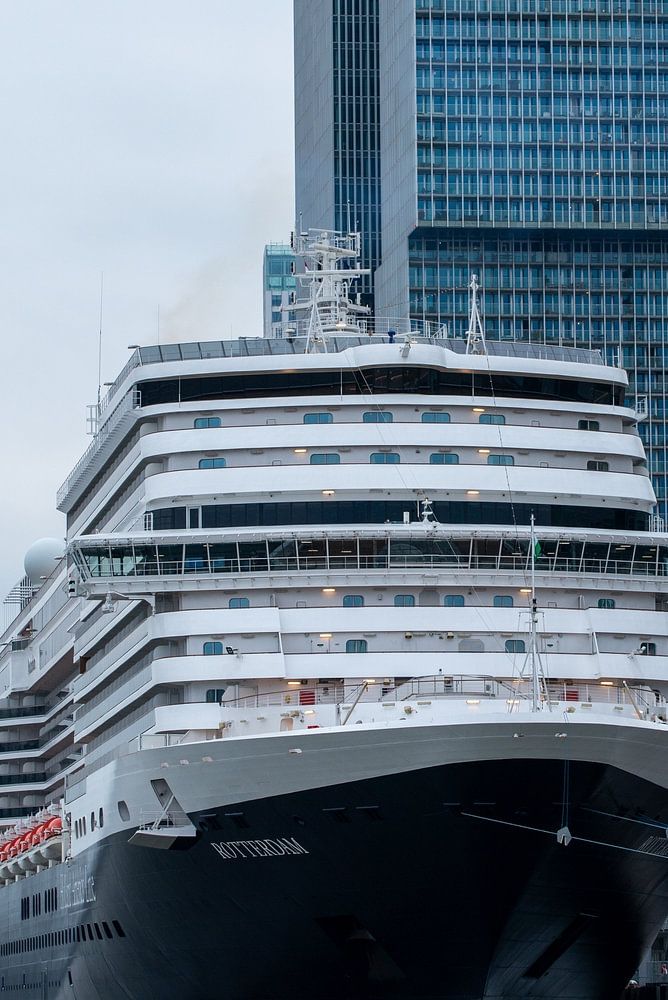 Das Kreuzfahrtschiff der Holland America Line, Rotterdam, liegt am Kai von Kop van Zuid fest. Im Hintergrund sind das Gebäude der Hafenbehörde und der alte Hef zu sehen, stumme Zeugen der Geschichte Rotterdams. Die Passagiere fahren in die Stadt ein, während dicke Festmacherleinen das Schiff mit den Pollern am Kai verbinden. Rundherum erheben sich moderne Neubauten auf historischem Boden - an demselben Ort, an dem die Schiffe der Holland America Line seit Jahrzehnten Menschen und Ziele miteinander verbinden.