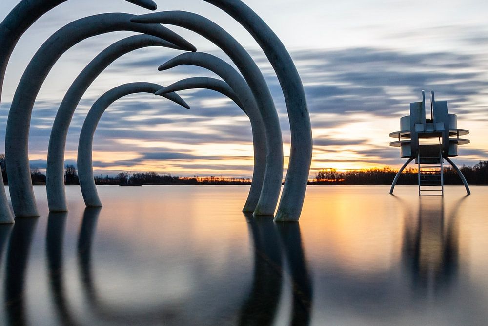 Ein außergewöhnliches Kunstwerk des Künstlers Rob Sweere. Es stellt die Vergangenheit, die Gegenwart und die Zukunft dar. Die Lage nach Osten macht es perfekt zum Fotografieren und/oder Bewundern bei Sonnenaufgang. Eine schöne rustikale Umgebung und zum Zeitpunkt des Fotografierens war Hochwasser, so dass der Steg unter Wasser stand, was dem Foto eine schöne Atmosphäre verlieh.