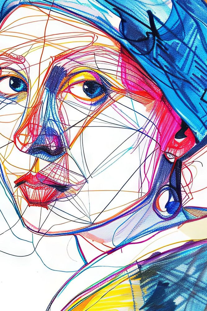Diese Zeichnung transformiert das berühmte "Mädchen mit dem Perlenohrring" in eine Studie aus reinen Linien und Konturen. Mit minimalistischer Eleganz und einer besonderen Betonung auf Form und Struktur bietet dieses Kunstwerk eine neue Sichtweise auf Vermeers Klassiker. Die goldenen und schwarzen Linien auf dem weißen Grund wirken sowohl modern als auch zeitlos und lassen das Porträt in seiner Simplizität und Komplexität gleichzeitig leuchten. Dieses Stück passt perfekt in eine Sammlung, die das Wesentliche schätzt und sich nach einem Hauch von avantgardistischer Klarheit sehnt.