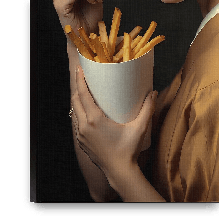 Das Kunstwerk, das in jeder niederländischen Snackbar hängen sollte. Das Mädchen mit der Perle isst eine Pommes. Eine Anspielung auf Vermeers Kunstwerk "das Mädchen mit der Perle" in einer zeitgenössischen Version.