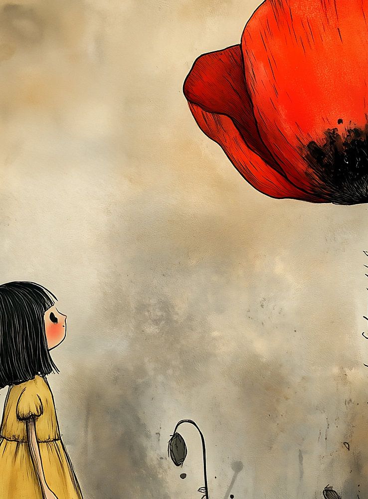 Das Bild zeigt ein Mädchen in einem einfachen senfgelben Kleid, das in einer traumhaften Landschaft steht und zu einer überdimensionalen Mohnblume aufschaut. Die weichen, erdigen Töne und subtilen Lichtstrahlen schaffen eine magische, fast märchenhafte Atmosphäre, in der die Natur größer und schöner erscheint als die Realität.