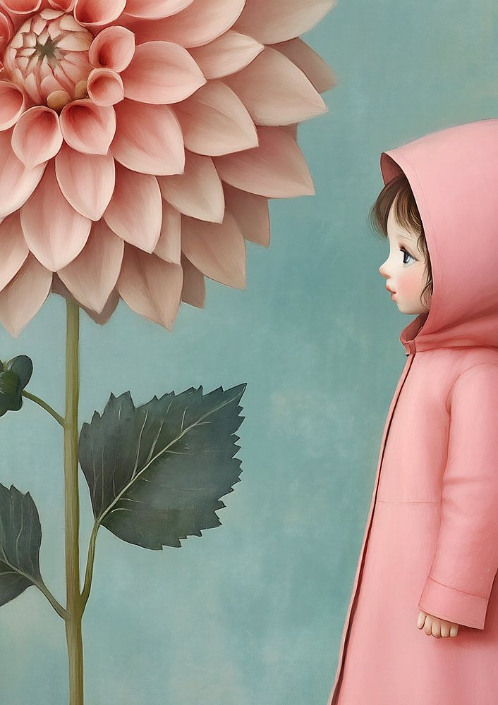 Ein Mädchen in einem blassrosa Mantel und passenden Stiefeln steht anmutig da, während eine zartrosa Dahlie neben ihr ruht. Die Komposition ist heiter und atmosphärisch und ruft ein Gefühl des Staunens und der stillen Selbstbeobachtung hervor.
