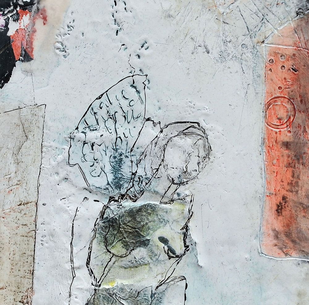 Abstrakte Darstellung von verträumten Menschenfiguren mit einem Huhn. Fantasie, die dem Betrachter Raum für eigene Assoziationen lässt. Mischtechnik in Enkaustik (Bienenwachs).