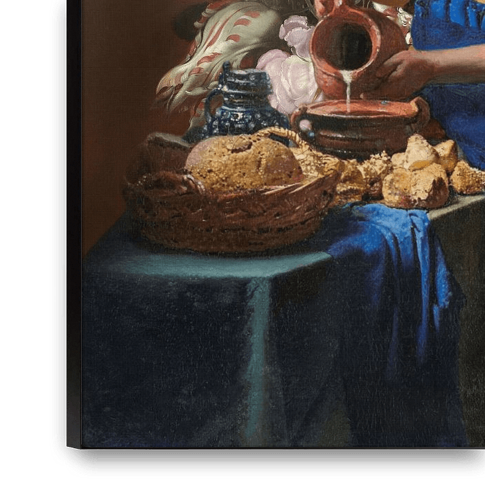 Zwei alte Meister, vereint in einer Collage. Das berühmte Milchmädchen von Johannes Vermeer mit einer bunten Blumentapete des Altmeisters Balthasar van der Ast als Hintergrund. Die Originalwerke sind im Rijksmuseum in Amsterdam ausgestellt.