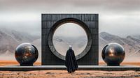 Vor einer dramatischen Kulisse aus nebligen, kargen Bergen und einer weiten Wüstenlandschaft erhebt sich eine monumentale Struktur aus dunklem Stein. Im Zentrum des Bildes dominiert ein rechteckiger Rahmen mit einem präzisen, kreisrunden Durchgang. Dieser wirkt wie ein Tor in eine andere Dimension, durch das der Blick in die unendlichen…