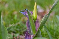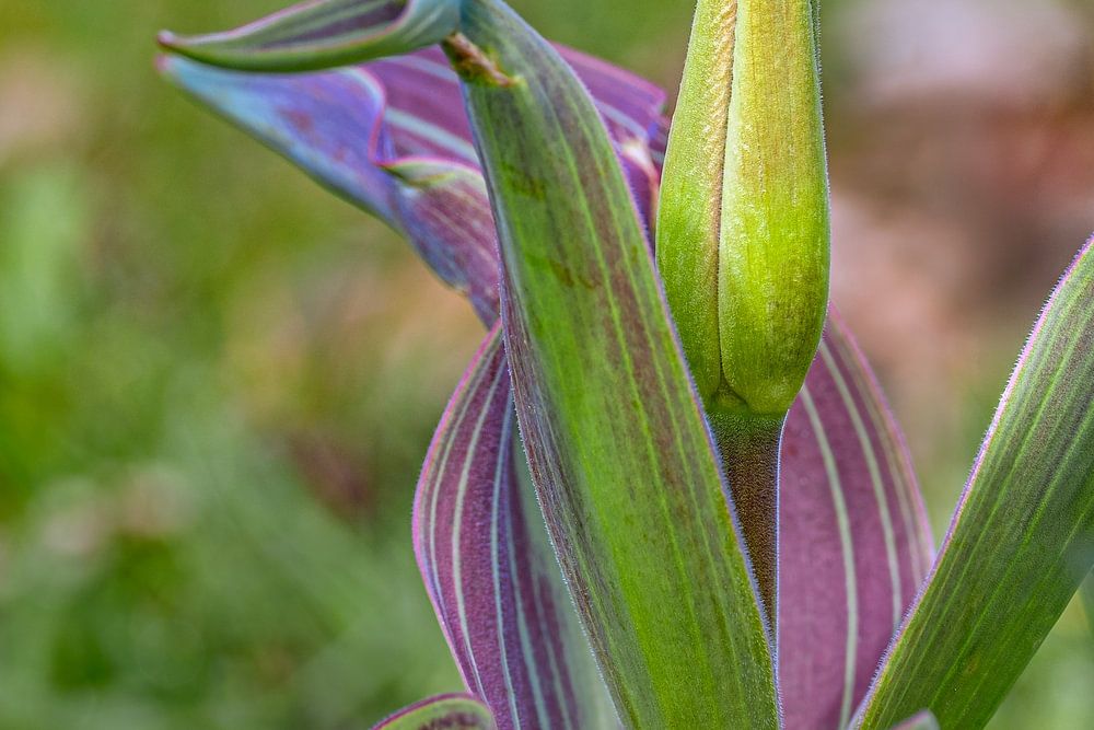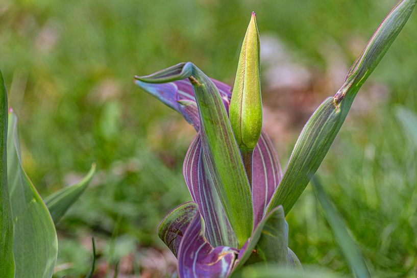 Inmitten sanfter Unschärfe erhebt sich die stolze Knospe einer Greigii-Tulpe, die in ihrem eleganten Goldgrün den baldigen Frühling verkündet. Besonders markant wirken die kunstvoll geschwungenen Blätter, deren tiefviolette Längsstreifen durch die präzise HDR-Technik eine fast haptische Tiefe erhalten. Das weiche Licht betont die feinen…