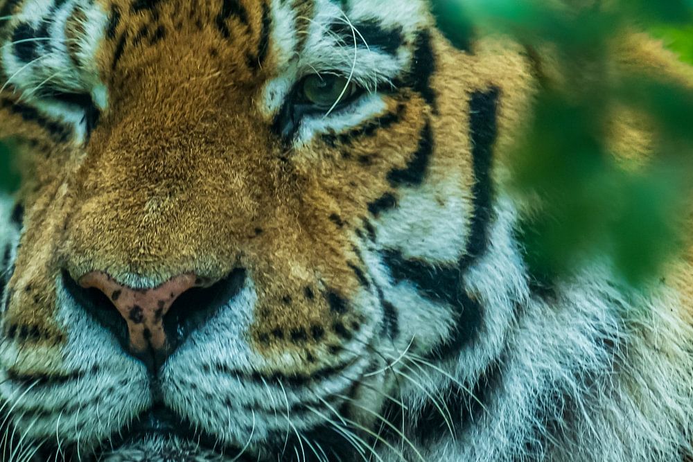 Schönes Porträt eines Tigers. Zwischen den Bäumen fotografiert, was ein sehr schönes Bild ergibt.