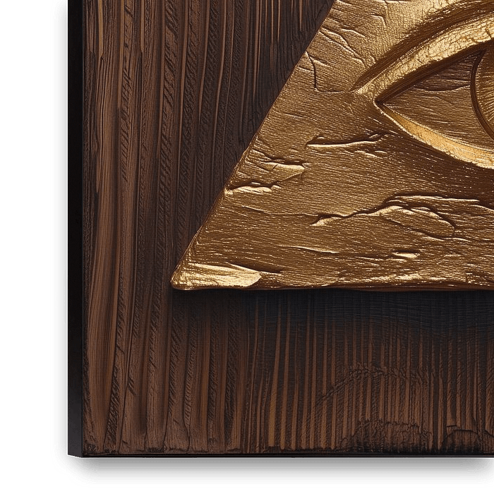 Dieses Kunstwerk zeigt das allsehende Auge in einem mystischen Design aus Gold. Erleben Sie die Tiefe dieses kraftvollen Symbols, eingefangen im warmen Schein des tropischen Holzes. Lassen Sie sich von der Symbolik der Allwissenheit und der Verbindung zwischen spiritueller Kraft und natürlichen Elementen verzaubern.