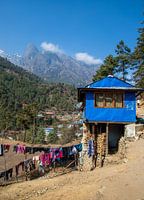Auf dem Weg nach Monjo in Nepal kommen Sie an dem blauen Haus vorbei.