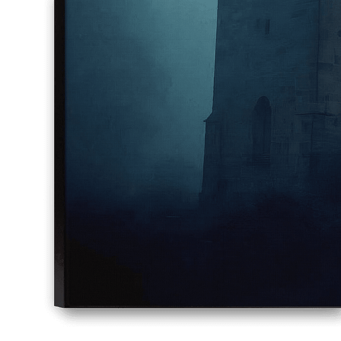 Dieses faszinierende Kunstwerk fängt die St. Georgs-Kirche in Eystrup (Niedersachsen) in einer beinahe übernatürlichen Atmosphäre ein. Eingebettet in dichten, blauen Nebel, erhebt sich das historische Steingemäuer als ein Anker der Ruhe.