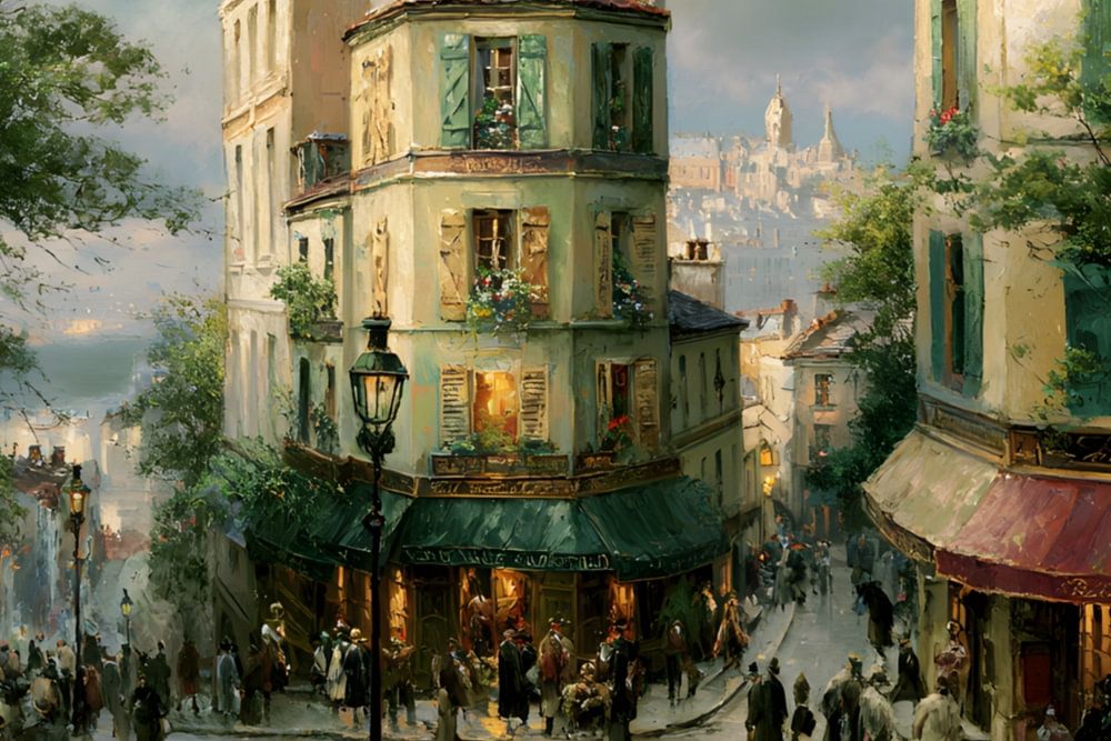 Das Gemälde zeigt eine malerische Straßenszene im Pariser Viertel Montmartre. Kopfsteinpflaster glänzt im sanften Nachmittagslicht nach einem leichten Regen. Die schmalen Häuser mit ihren grünen Fensterläden, bunten Markisen und blumengeschmückten Fenstern schaffen eine warme, lebendige Atmosphäre. Menschen in klassischer Kleidung der Jahrhundertwende spazieren die Straße hinab, unterhalten sich oder bummeln an Cafés vorbei. Im Hintergrund erhebt sich sanft die Silhouette der Stadt über den Dächern.