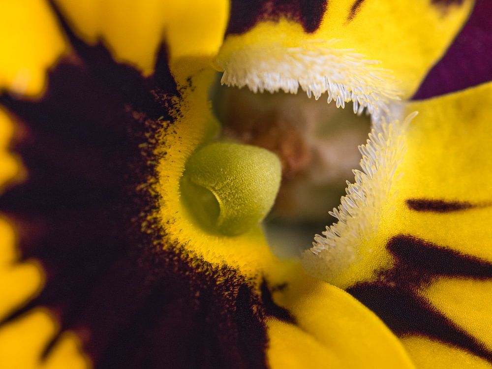 Das "lächelnde" Purpur-/Bordeauxrot mit Gelb Veilchen ist ein Makrobild des Stiefmütterchenherzens. Durch die Linienzeichnung des Veilchens sieht es mit etwas Fantasie wie ein lächelndes Gesicht aus. Der Fokus des Fotos liegt auf den Blättern des Veilchens.