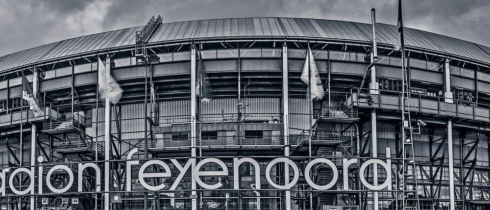 Panorama von De Kuip in schwarz-weiß kurz vor Sonnenuntergang. Es ist nach wie vor das schönste Stadion der Niederlande.