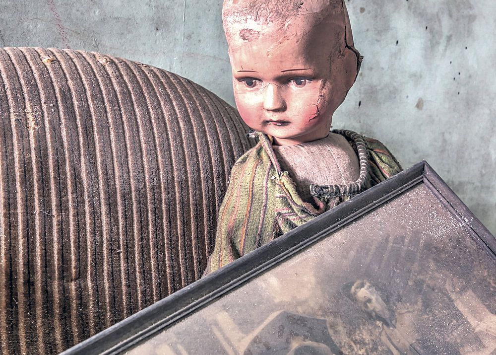 Oude pop (speelgoed) met oude foto in verlaten kasteel