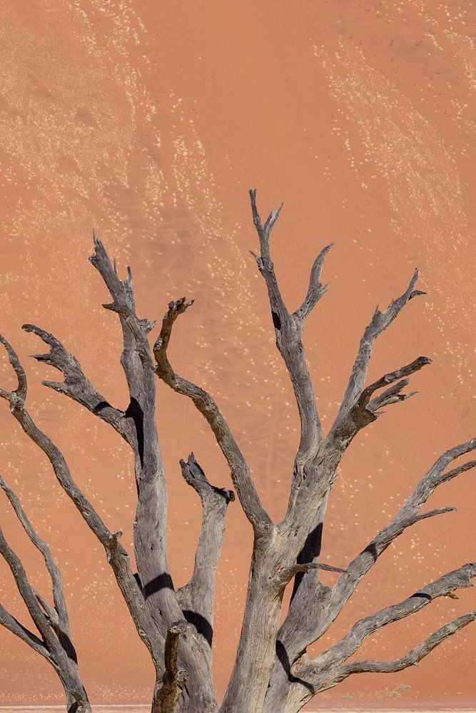 Ein toter Baum auf der Salzwüste Deadvlei vor einer großen roten Sanddüne und dem strahlend blauen Himmel darüber. Deadvlei liegt in Namibia und kann von Sesriem aus erreicht werden. Dieser Ort steht schon seit Jahren auf meiner Besuchsliste, denn es ist eine sehr surreale Umgebung, in der man sich völlig verlieren kann. Wahrhaftig schön.