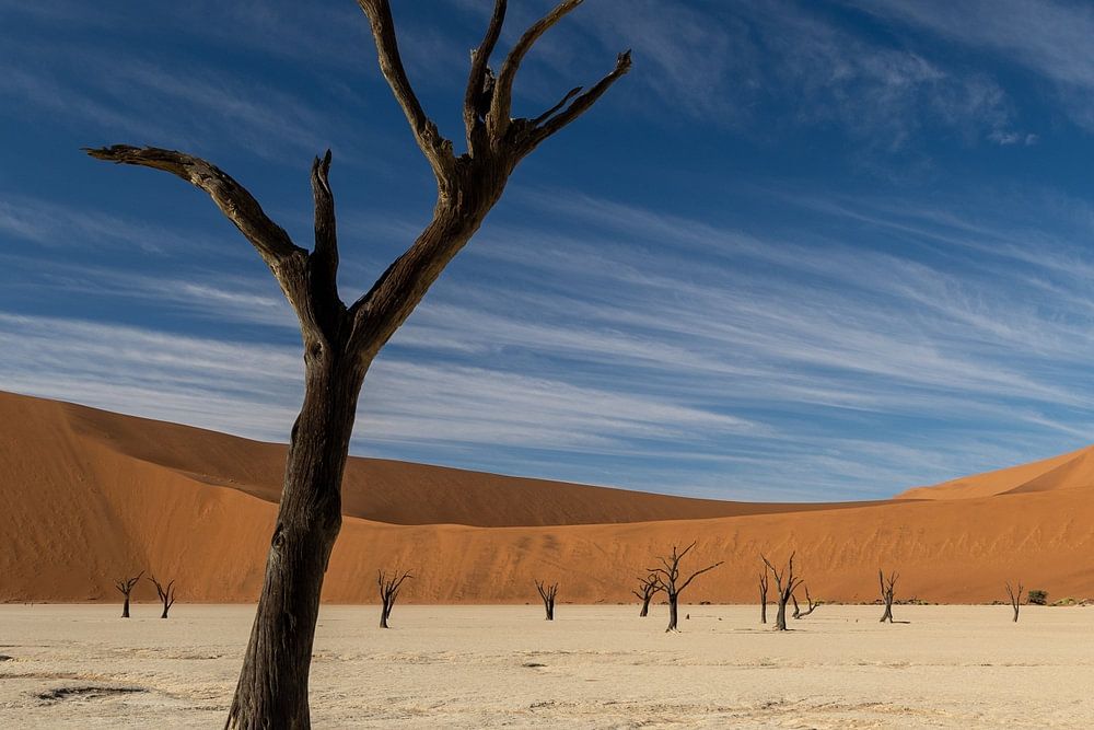 Auf der trockenen Ebene des Deadvlei in Namibia stehen seit Tausenden von Jahren tote Bäume. Denn sie heben sich dunkel von den roten Dünen im Hintergrund und dem fast weißen Hintergrund des getrockneten Klammfests ab. Es ist ein wunderschöner Ort zum Fotografieren.