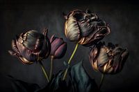 Lass dich von der geheimnisvollen Eleganz dieses bezaubernden fotorealistischen Gemäldes verzaubern. Die dramatisch beleuchteten Tulpen, dargestellt in tiefen Tönen von Purpur, Gold und nächtlichem Grün, bringen ein Gefühl von Luxus und stiller Intensität in jeden Raum.