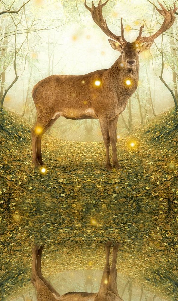 Verträumte Fantasieszene mit einem Hirsch in einem verwunschenen Wald, dessen Spiegelbild im stillen Wasser eines Baches zu sehen ist.