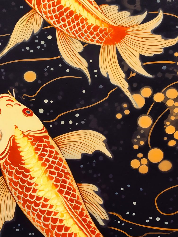 Goldene Kois sind eine Farbvariante des japanischen Karpfens, der in der japanischen Kultur eine große symbolische Bedeutung hat. Goldene Kois stehen für Reichtum, Erfolg und Glück. Sie sind auch ein Zeichen für die Verwandlung von einem gewöhnlichen Fisch in einen mächtigen Drachen, wenn sie es schaffen, gegen den Strom zu schwimmen und die Wasserfälle zu überwinden. Hol dir Reichtum, Erfolg und Glück ins Haus mit diesem Poster goldener Kois.
