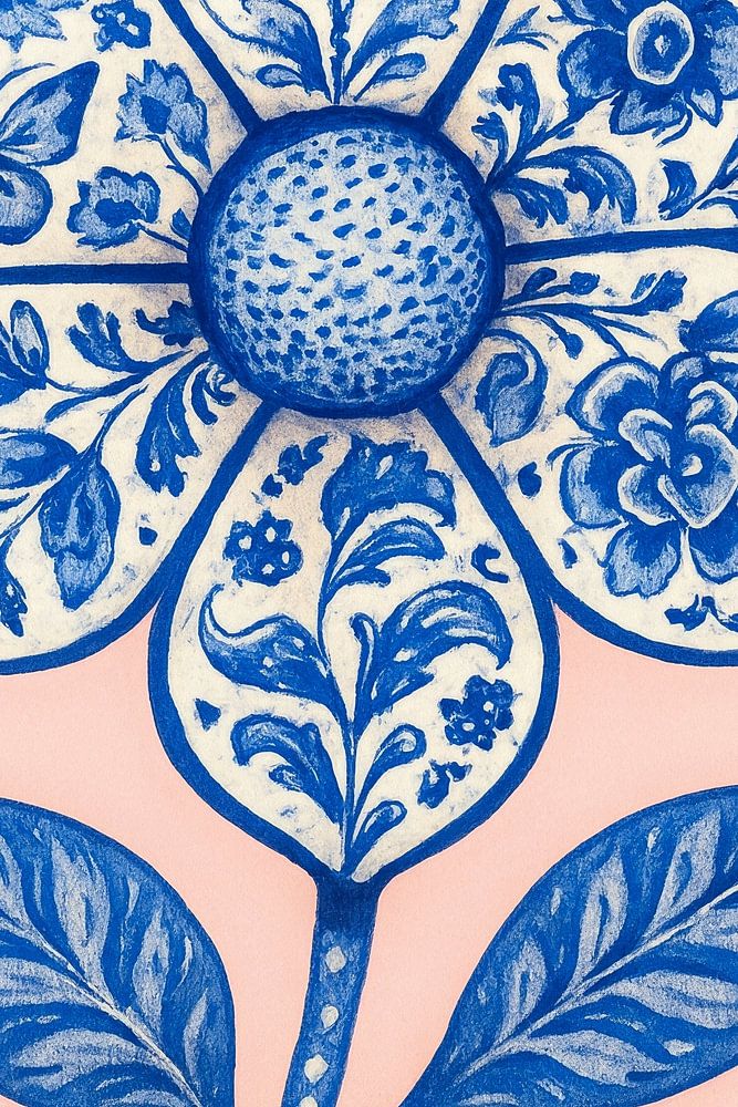 Eine einzigartige Interpretation der traditionellen Delfter Blaukunst, bei der eine Blume mit reichen Details aus Flora und Fauna zum Leben erwacht. Der sanfte pastellfarbene Hintergrund bietet einen modernen Kontrast, der es zeitlos macht.