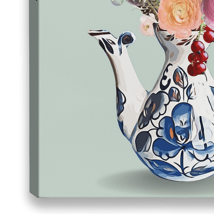 Dies ist kein Foto, sondern ein digital komponierter Entwurf einer delfterblauen Kaffeekanne mit einem Blumenstrauß und Federn.
