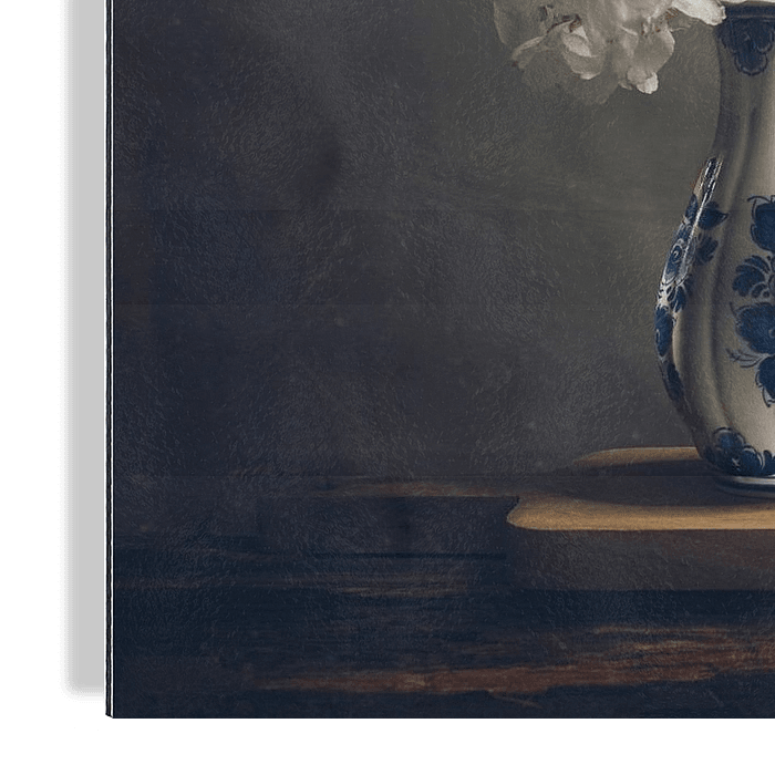 Bestelle dieses Stilleben Delfter Blau mit Apfelblüte von Joey Hohage als Reproduktion auf Leinwand, Alu-Dibond, als Poster, Fototapete oder Acrylglasbild.