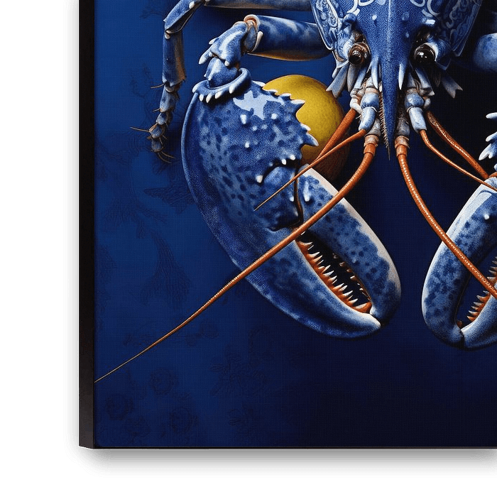 Schönes Bild in Königsblau. Ein Hummer im Stil von Delft's Blue. Zwischen Zitronen. Die gelbe Farbe der Zitronen bildet einen schönen Kontrast zu dem tiefen Blau. Ein Bild, das die Atmosphäre in jeder Küche aufwertet, aber sicherlich auch in ein modernes Interieur passt. Kurzum, ein schönes Stillleben.