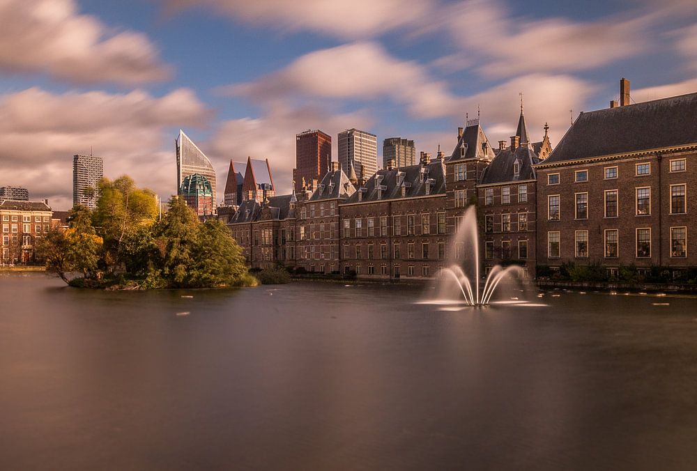Den Haag - Der Hofvijver mit den Gebäuden des 2. Saales im Hintergrund und dort wiederum hinter der neuen Himmelslinie von Den Haag.