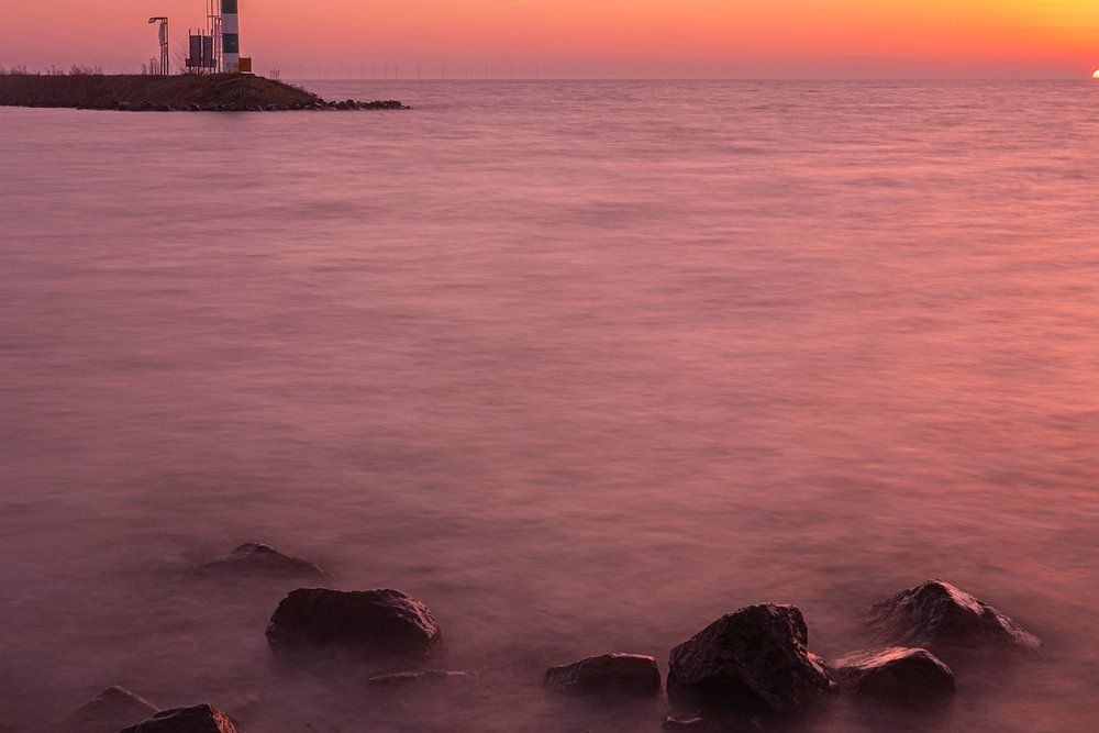 Schöner Sonnenaufgang in Den Oever. Neben dem Hafen stehen Leuchttürme, um die Schiffe zu warnen und ihnen den Weg zum Hafen zu weisen.