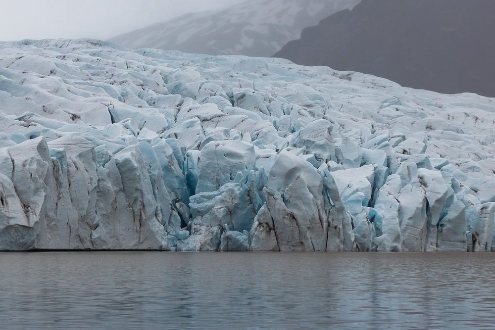 Vor Ihnen entfaltet sich die geheimnisvolle Landschaft des Fjallsárlón, eines Gletschersees im Süden Islands. Im ruhigen Wasser spiegelt sich die eisige Wand des Gletschers, die sich imposant und uneinnehmbar aus dem Nebel erhebt. Hinter dieser gefrorenen Front zeichnen sich die Konturen der Berge wie Schatten ab, die der Szene Tiefe und Schattierungen verleihen.