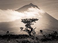 Sepiaaufnahme eines Baumes vor dem Bergvulkan Pico auf der Insel Pico, Azoren, Portugal.