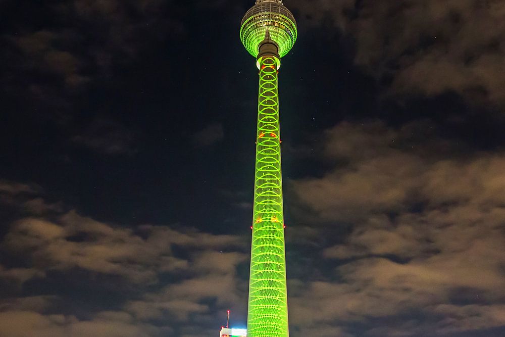 Der Berliner Fernsehturm am Alexanderplatz in der Nacht in besonderer Beleuchtung, anlässlich eines Berliner Lichterfestes.
