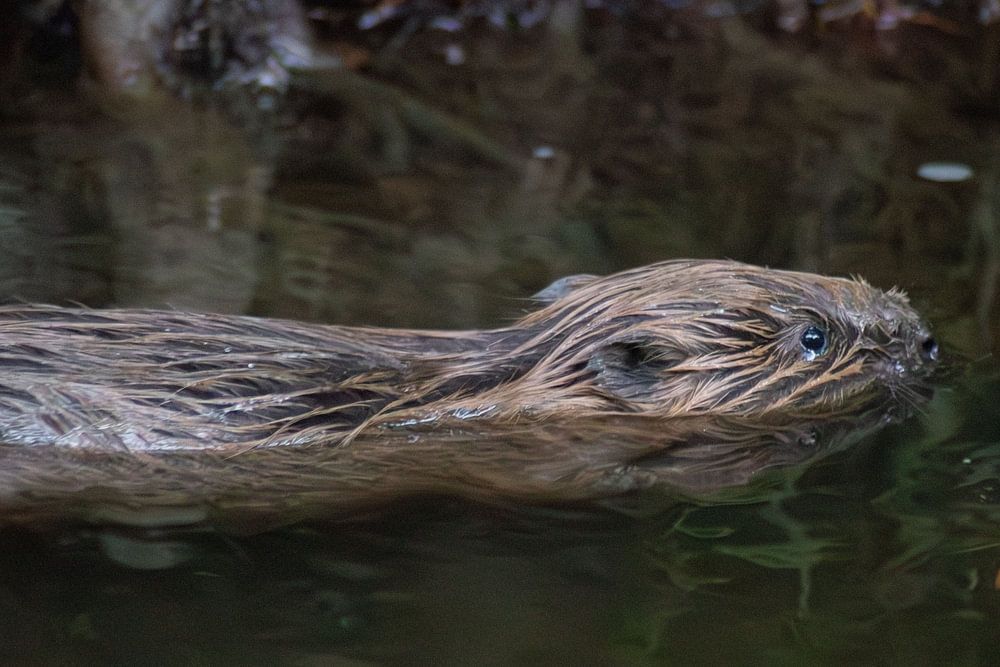 Ein Biber gleitet lautlos durch das Wasser entlang des Ufers, mit Wurzeln und Vegetation im Hintergrund. Das glänzende, nasse Fell und der scharfe Blick verleihen dem Tier ein kraftvolles und doch ruhiges Aussehen. Das Bild fängt einen intimen Moment im natürlichen Lebensraum dieses ikonischen Tieres ein.