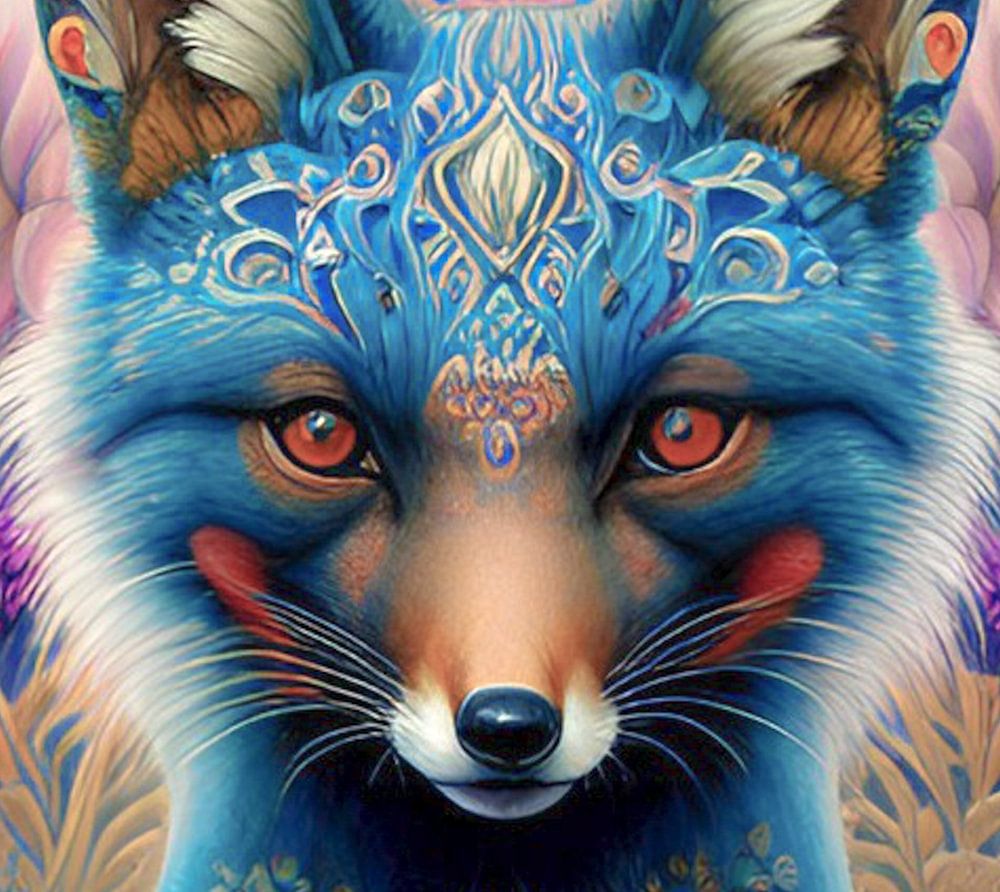 Der blaue Fuchs ist ein digitales Kunstwerk mit Stammeszeichnungen und Blumen und einem schönen Farbkontrast. Ein einzigartiges Kunstwerk