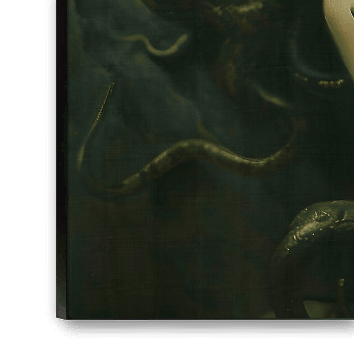 In diesem faszinierenden Portraitgemälde im Stil von William Turner wird Medusa in einem Moment der Kontemplation und Mysterium dargestellt. Ihr Blick ist intensiv und geheimnisvoll, während sich wirbelnde Schlangen um sie herum schlängeln. Das Spiel von Licht und Schatten verleiht dem Gemälde eine dramatische Atmosphäre, die die Betrachter in den Bann zieht. Die Farben sind lebendig und kontrastreich, und verleihen dem Bild eine tiefe emotionale Wirkung. Dieses Kunstwerk fängt die Essenz von Medusa als mythologische Figur ein und interpretiert sie auf eine einzigartige und kraftvolle Weise.