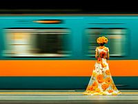 Surreales Kunstwerk einer Frau, die von hinten auf einem Bahnsteig steht und deren Kopf vollständig von einem üppigen Strauß orangefarbener Blumen bedeckt ist, während eine blau-orangefarbene U-Bahn vorbeifährt - ideal als faszinierender…