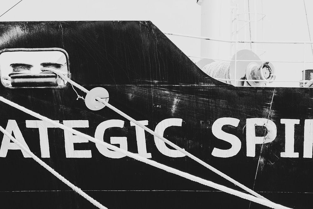 Der Bug des Ozeandampfers ragt hoch über Ihnen auf, fotografiert von einem niedrigen Aussichtspunkt im Hafen. Das Schiff liegt leer an der Kaimauer. Vorne heben sich die schweren Festmacherleinen scharf ab, während der Mast mit dem Schiffshorn dezent im Licht erscheint. Die Winden und Laufräder heben sich scharf ab. Rostflecken und Abnutzungsspuren im Lack erzählen die Geschichte von vielen Fahrten. Alles ist in kontrastreichem Schwarz-Weiß eingefangen, wodurch jedes Detail noch besser zur Geltung kommt.