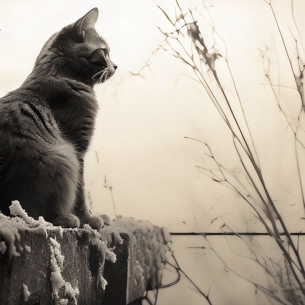 Auf diesem herzerwärmenden Bild in Sepiatönen sehen wir zwei Katzen auf einem Holzzaun in der frühen Morgensonne eines Wintertages sitzen. Die ganze Szene strahlt eine heitere Ruhe aus. Der Schnee hat die Welt mit einer weichen weißen Decke bedeckt, während die Sonne ihre Strahlen sanft auf die Katzen fallen lässt. Die Katzen sind in ihre dicken Wintermäntel gehüllt, und ihre flauschigen Schwänze hängen elegant über den Zaun.