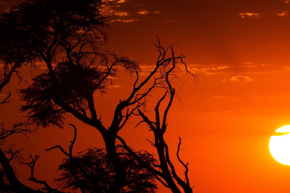 Ein afrikanischer Sonnenuntergang entflammt wie ein stilles Feuer.