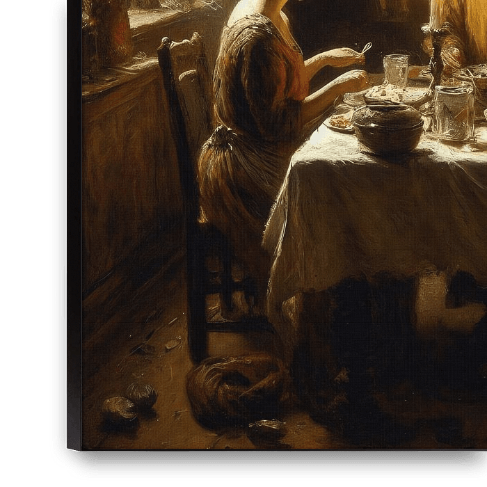 Ein Elefant steht imposant in einem rustikalen Zimmer, während ein älteres Ehepaar friedlich am Tisch speist. Diese surreale Szene wirft Fragen über den menschlichen Geist und die unbegrenzte Macht der Fantasie auf, wo nichts so ist, wie es scheint.