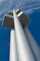 Der Fernsehturm Im Stadtteil Žižkov in Prag mit Ansicht von unten. Der imposante Turm hat eine Höhe von 216 Metern, Baubegin war im Jhre 1985 und die Einweihung wurde im Jahr 1992 gefeiert.