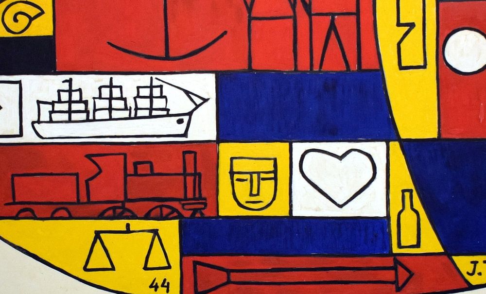 Moderne Kunst mit einem Fisch mit Bildern von einem Kreuz, Hoffnung, einem Mann und einer Frau, einem Stern, einer Waage, einem Herz, einem Pferd und einer Kutsche, einem Boot, einer Muschel, einem Zug, einem Herz usw.