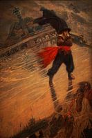 The flying Dutchman, der Matrose und Pirat aus dem seeländischen Terneuzen, steht mit seinen gespenstisch roten Augen auf dem Deck eines schräg liegenden Schiffes. Der Kapitän steht furchtlos im Sturm, während andere Matrosen oder andere Geister des Geisterschiffes sich am Boot festhalten.